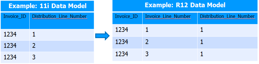 Another R12 data model change that could impact a decent number of custom reports and potentially other objects deals with the new ap_invoice_lines architecture. Any custom objects leveraging joins based on ap_invoice_distributions_all.distribution_line_number will certainly have to be reworked due to the change shown in this example to avoid cartesion products and/or errors with subqueries returning multiple rows.