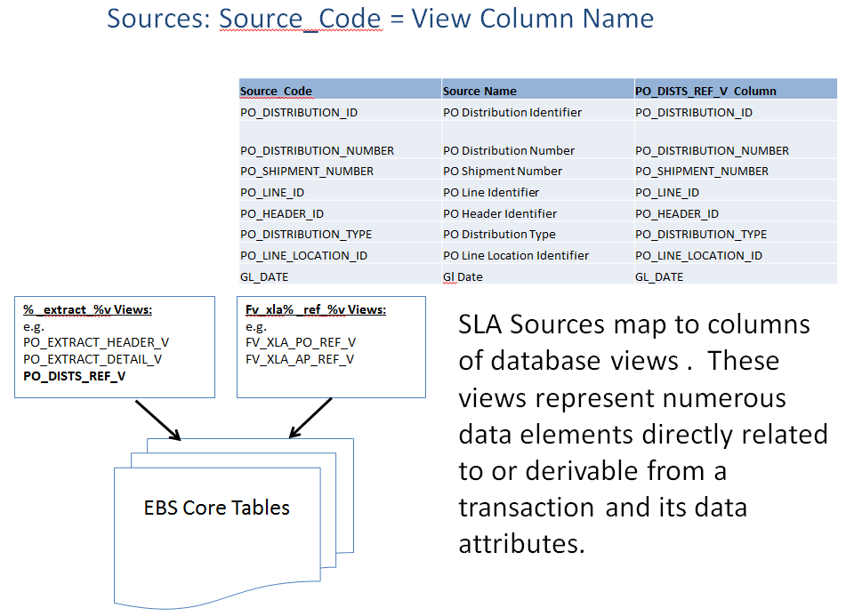 Upon further analysis and digging, I started understanding that these Sources map directly to numerous database views. The Source_Code is a direct key to the column names within views. These views then can often be deconstructed to figure out the source table data element which is driving the source. For sources which are already utilized in an existing Application Accounting Definition (AAD), the Source to View (aka extract_object_name) relationship can be shown by querying the xla_aad_sources table such as the following: