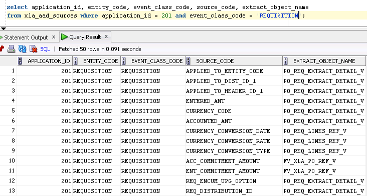 Furthermore, here is a query I’ve developed to be able to analyze the universe of various SLA sources available by Entity and Event Class (these are bind variables in the query) in SQL Developer: Available SLA Sources by Event.
